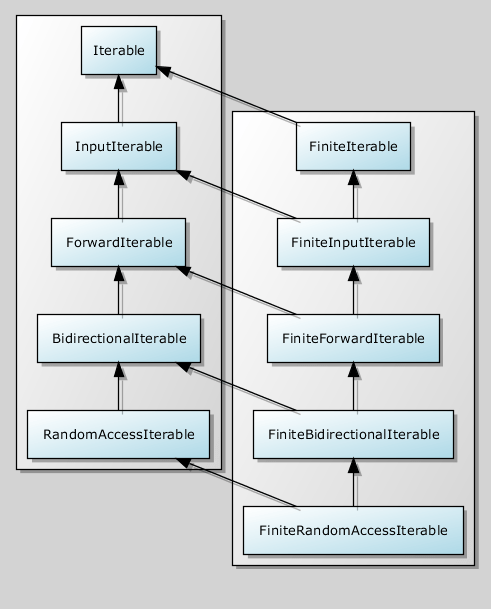 And as with Range, we don’t actually need to define all these concepts in code. “Finite-ness” is orthogonal to the Iterable concept hierarchy and can be queried separately.